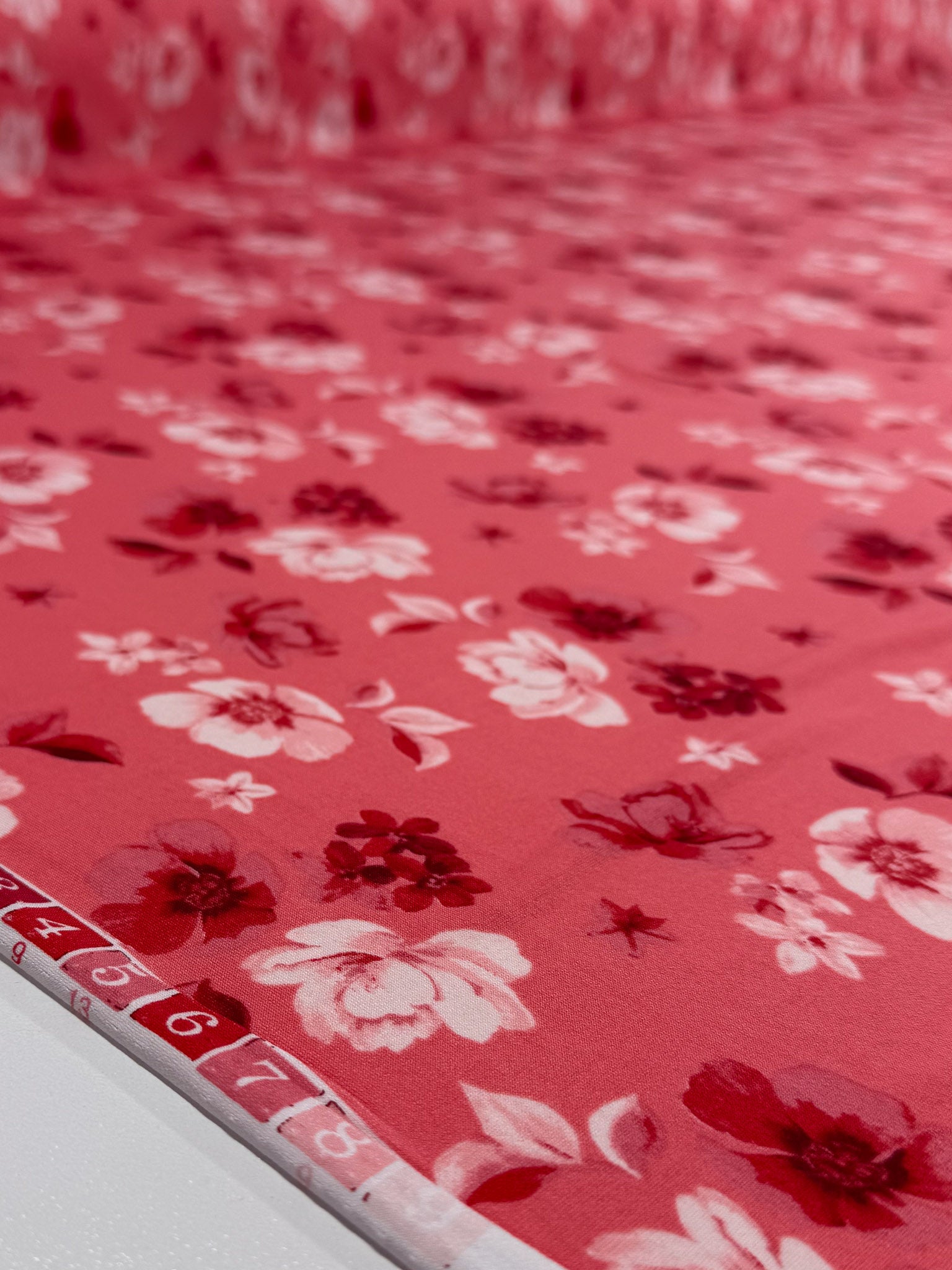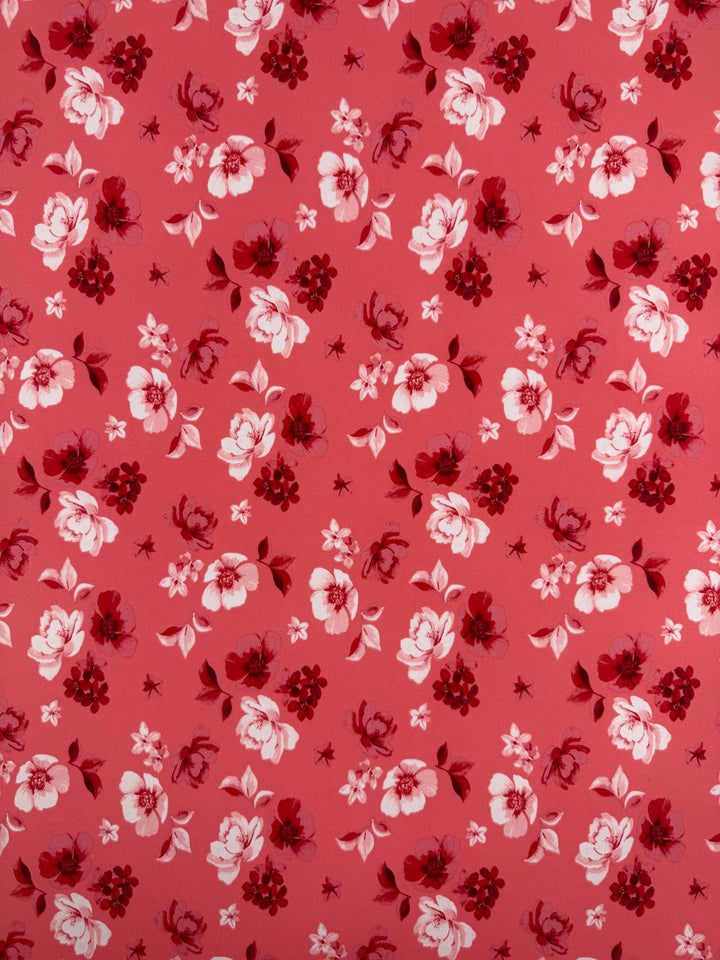 Our Printed Lycra is a Polyester/Spandex fabric that has a two-way stretch and comes in a variety of beautiful prints! Printed Lycra is a medium-weight fabric, has good durability and stretch, and washes well. Our Lycras are perfect for making tops, dresses, skirts, pants, accessories, and even childrenswear. A floral print in shades of red and white on a coral background.