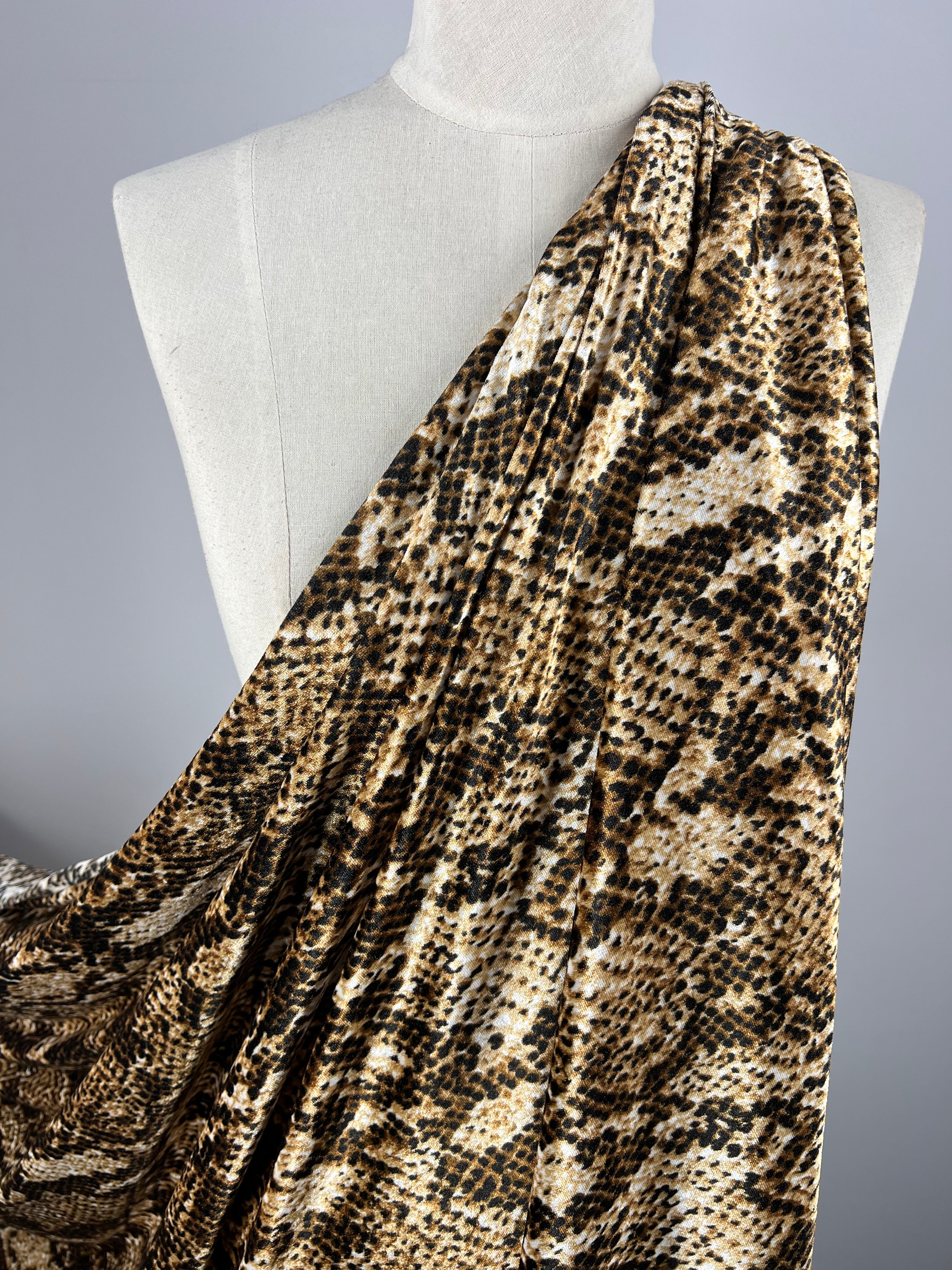Super Cheap Fabrics’ Printed Velvet - Python is a 150cm wide, light to medium weight polyester with a brown, black, and cream snakeskin print draped over a white dress form against a neutral background.