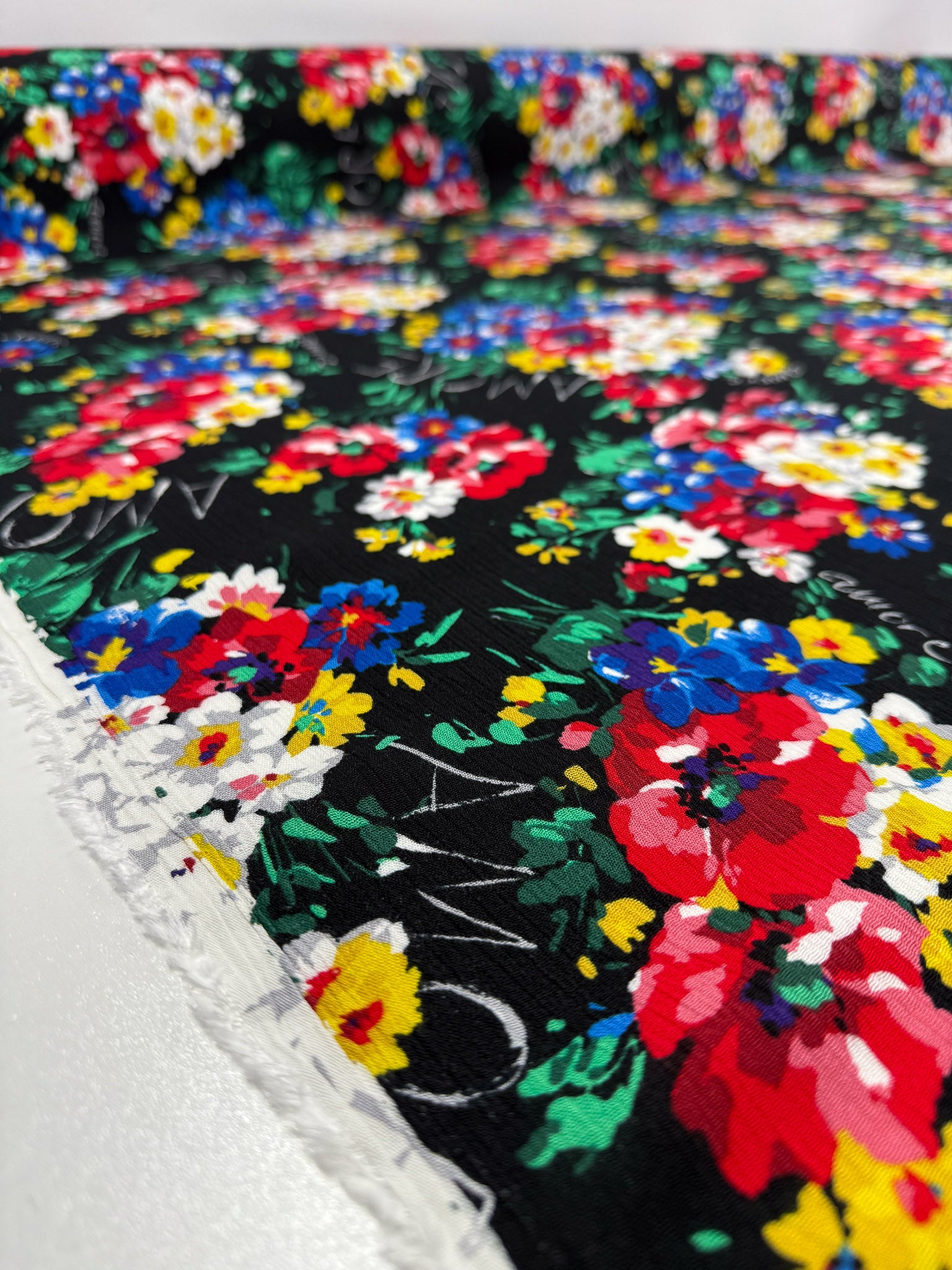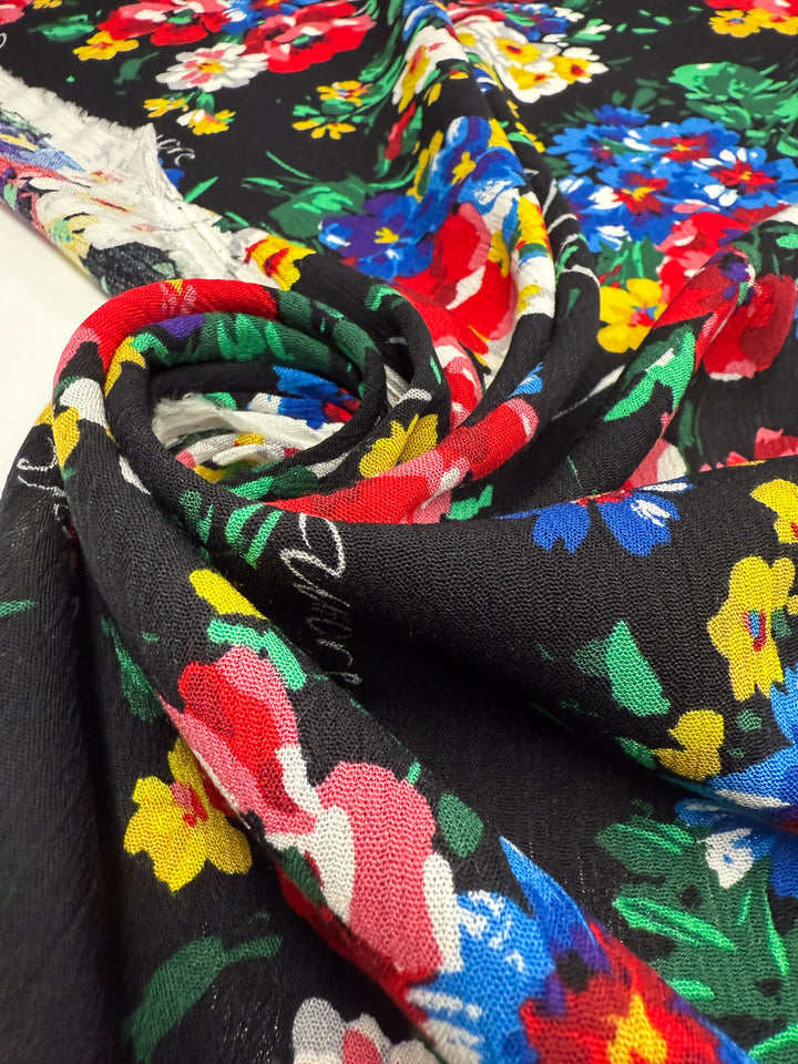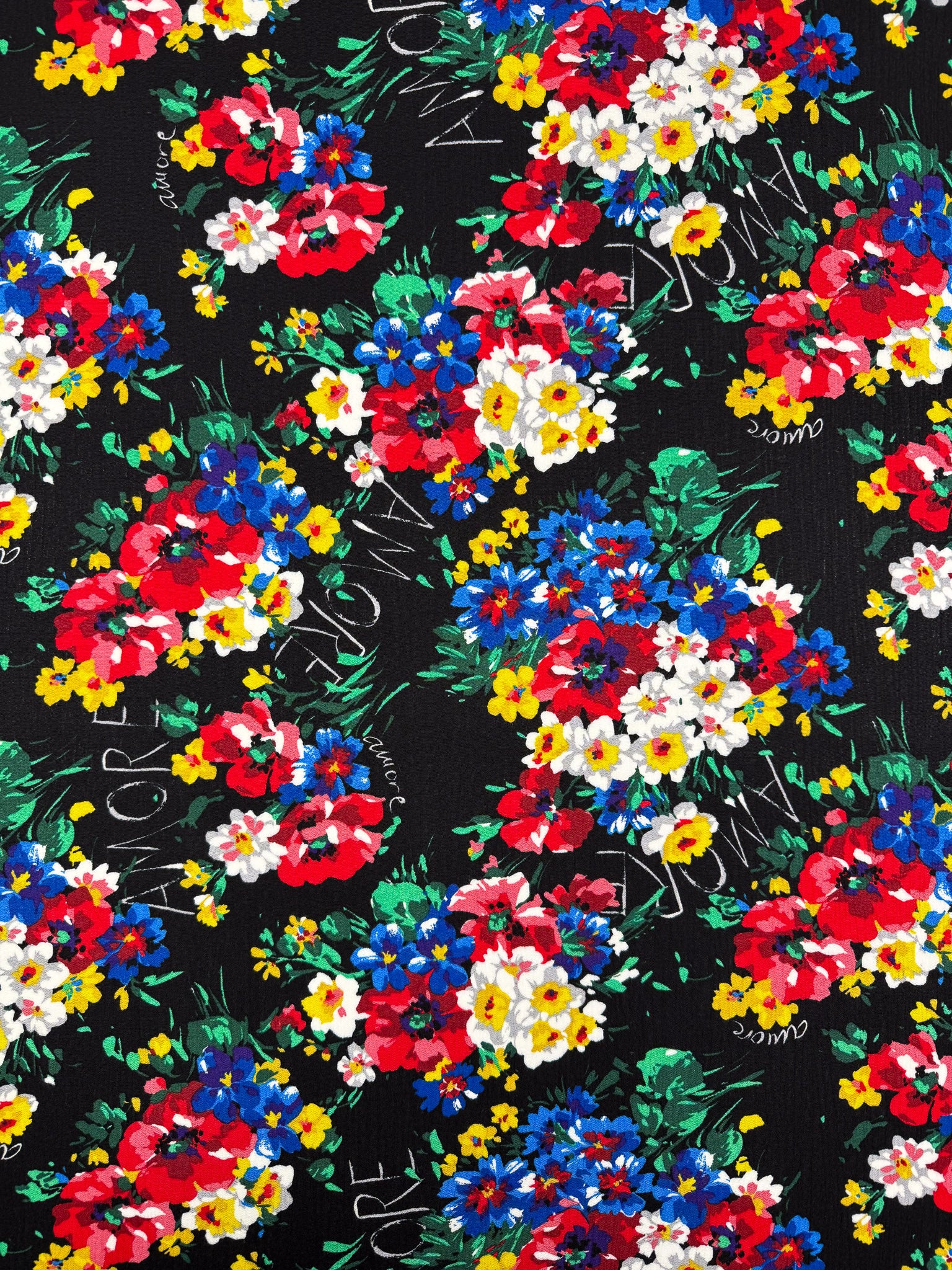 Designer deadstock haul from Prato, Italy. A Printed viscose with bold mixed florals and “Amore” script.