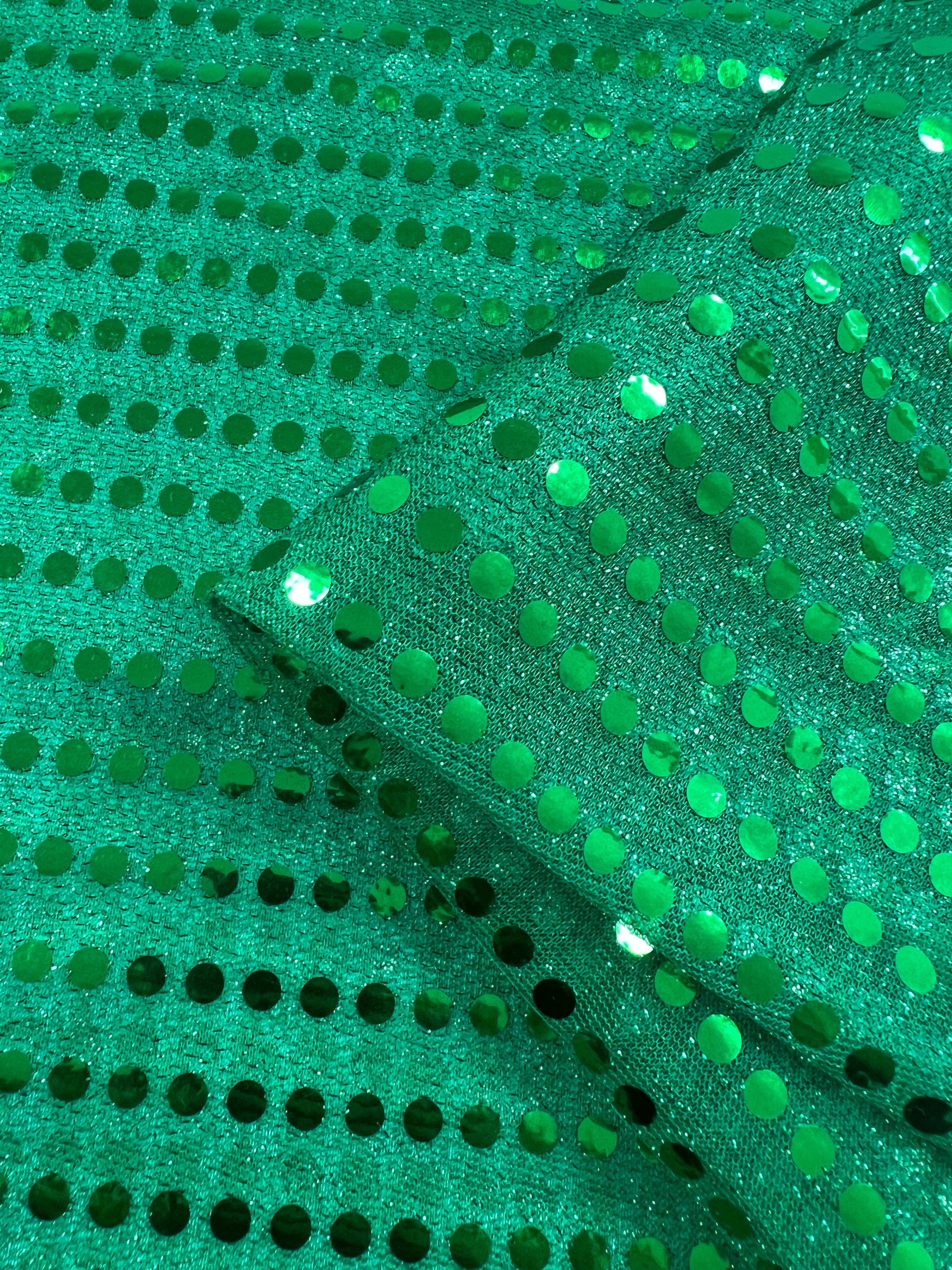 This beautiful high shine sequin fabric comes in shiny emerald spots on a green background. The vibrant nature of this fabric is suited for dancewear and costumes. This sequined fabric has an eye-catching shine that is hard to miss.