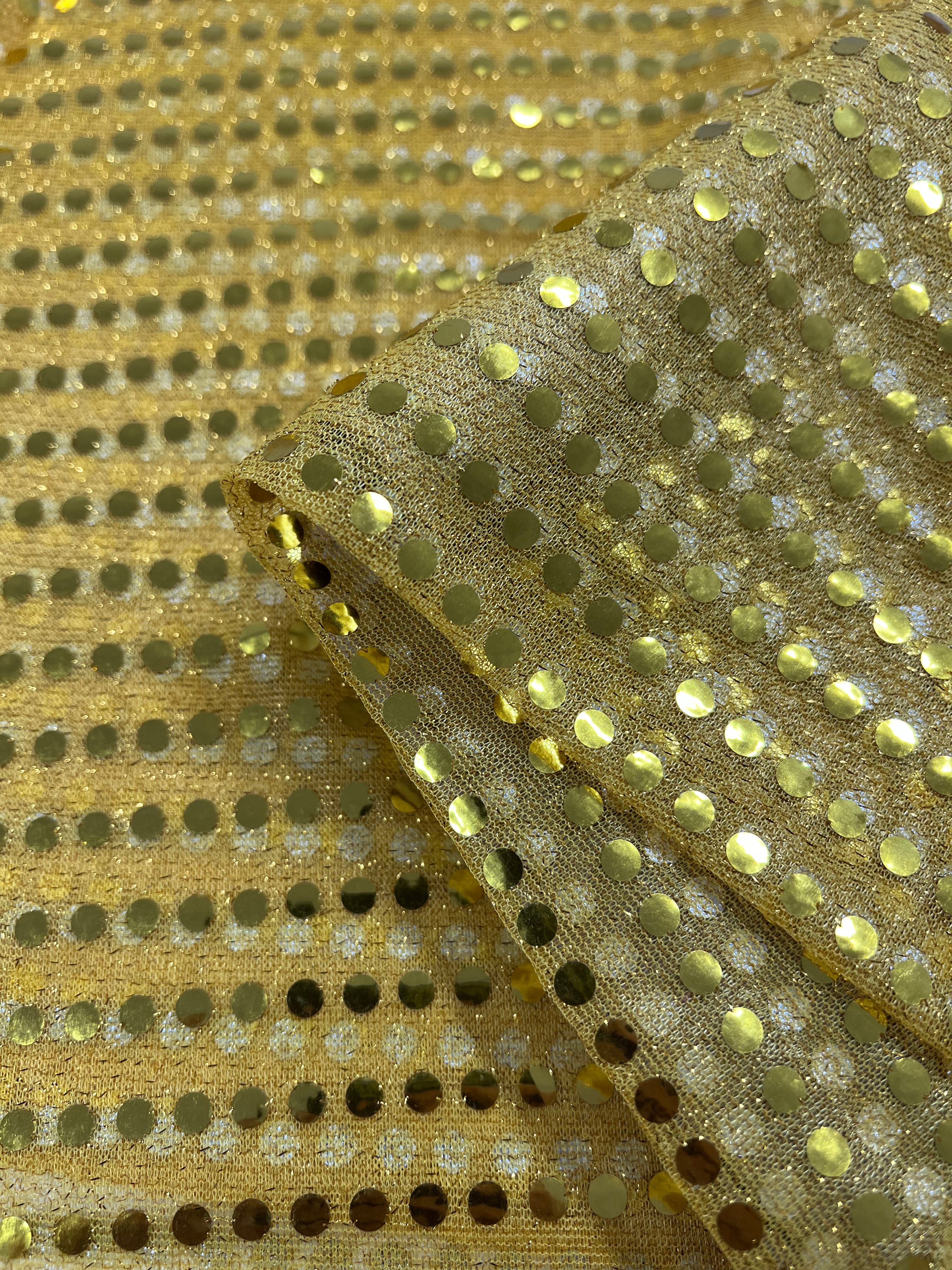 A close-up of Super Cheap Fabrics' Sequin - Gold - 112cm shows crinkled, lightweight gold fabric adorned with shiny round sequins, creating a vibrant, textured, and reflective surface.