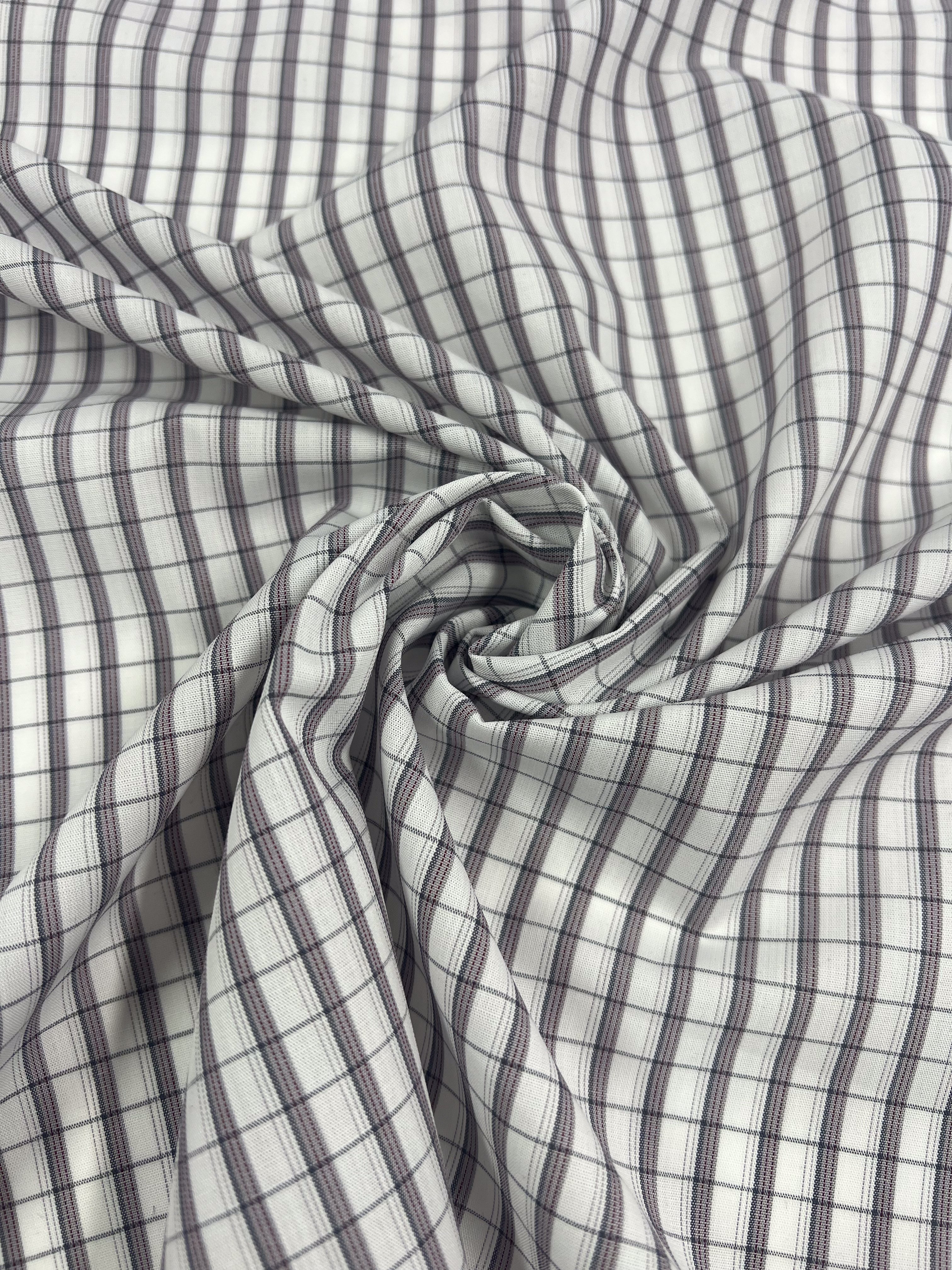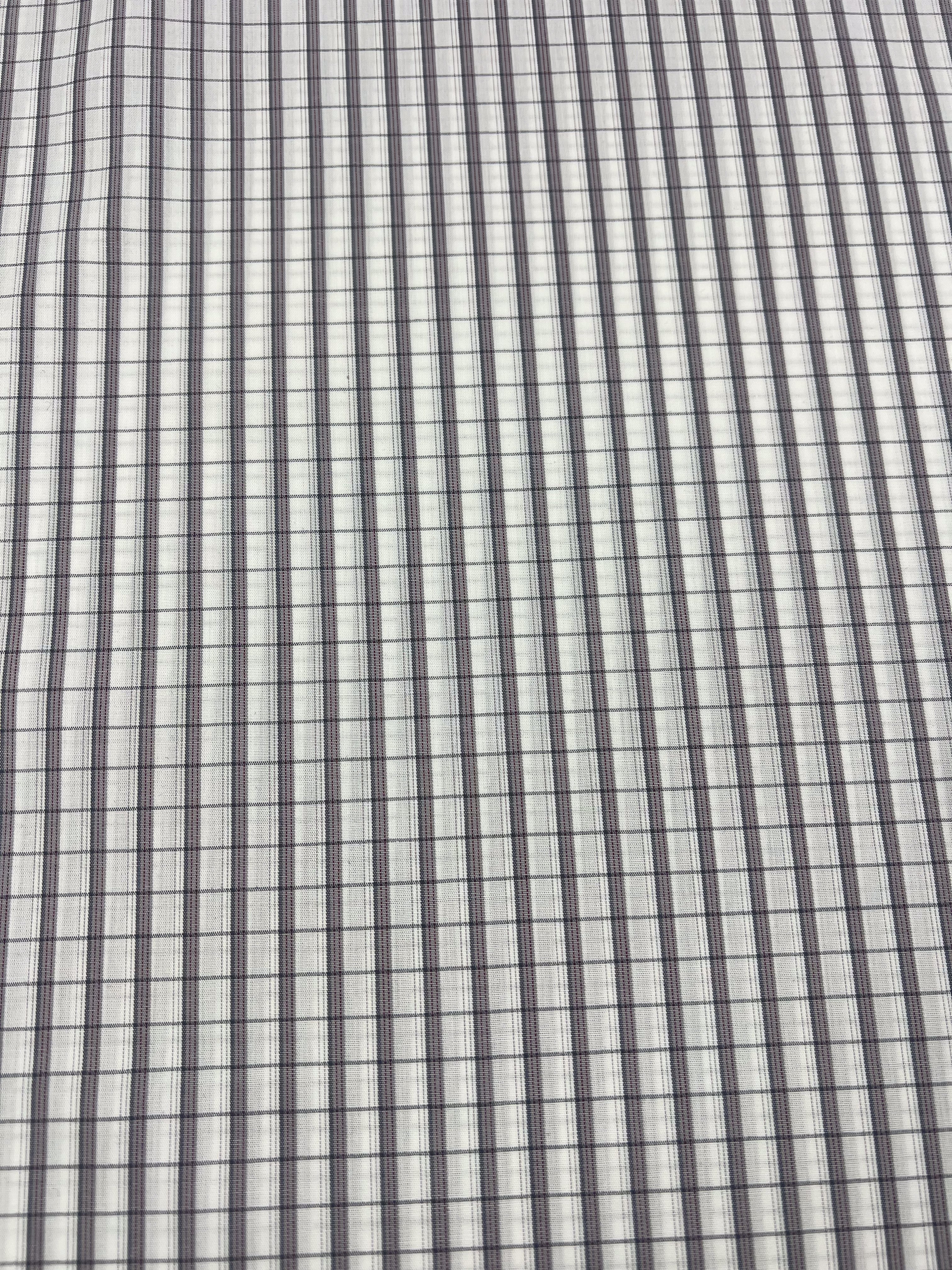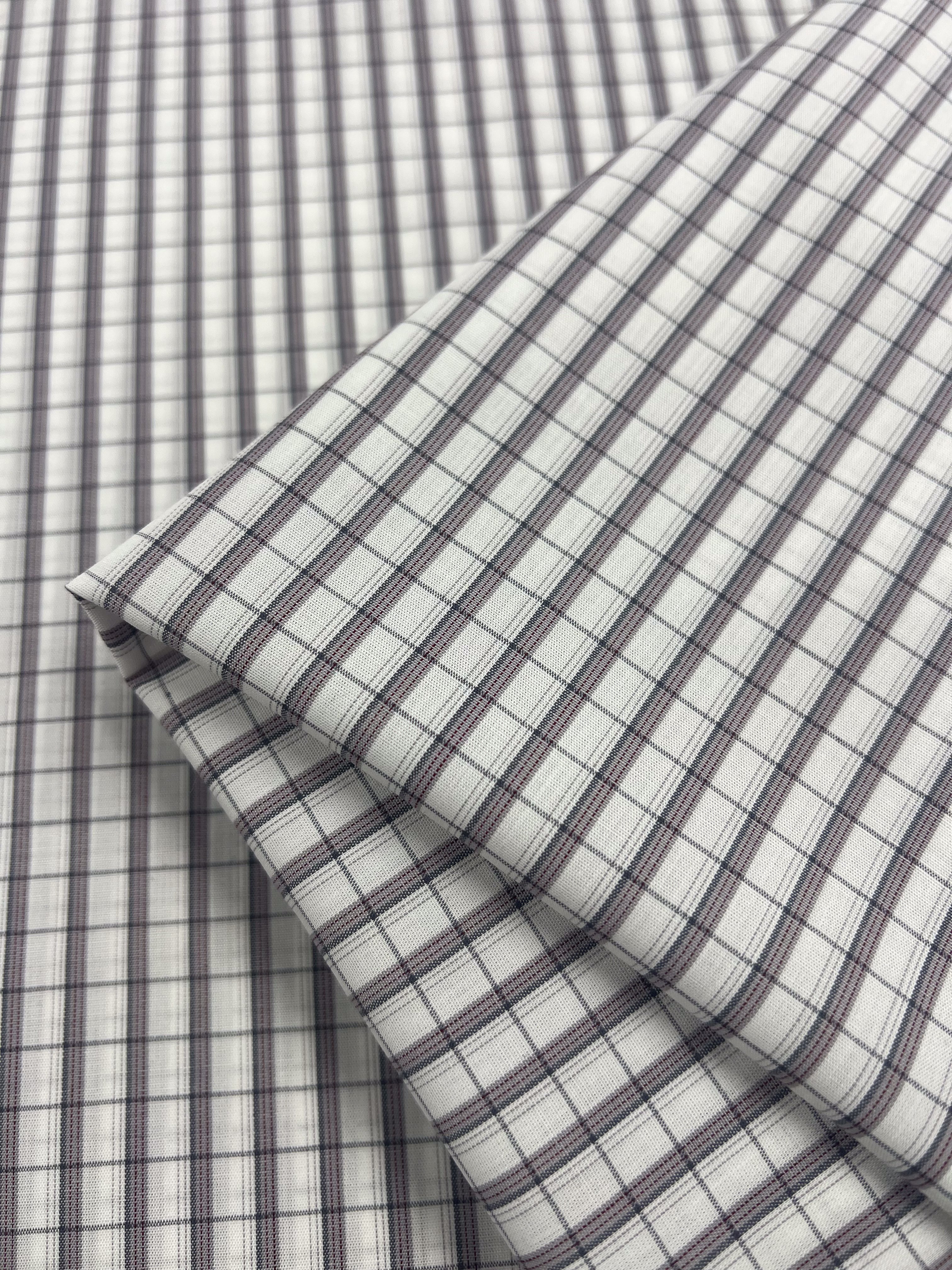 A close-up of the Shirting - Dave - 147cm from Super Cheap Fabrics displays a grid pattern of intersecting lines, creating small squares. The dark lines form a uniform, repetitive design against a light background, resembling lightweight fabric.