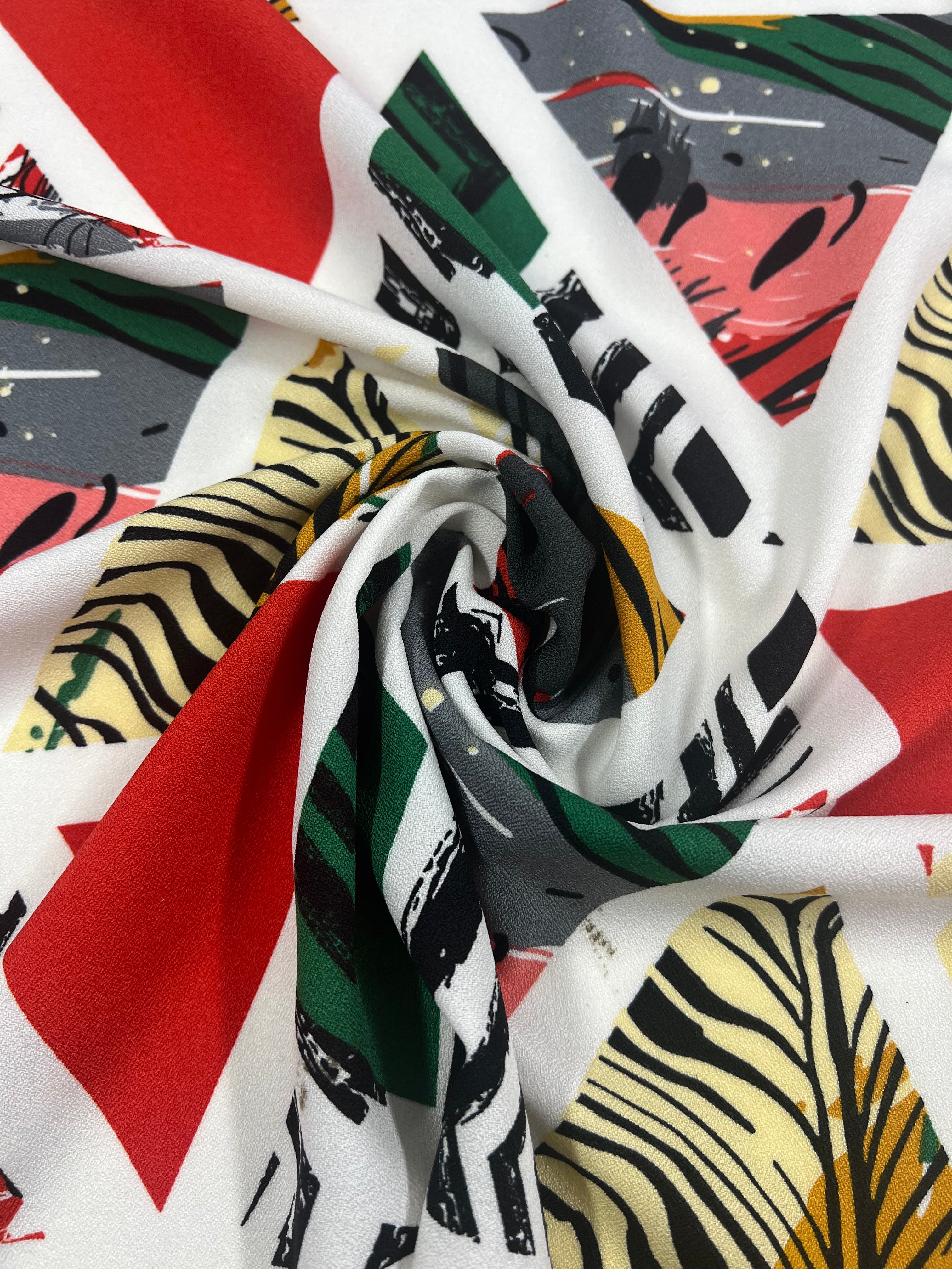 The Printed Crepe - Windows by Super Cheap Fabrics features a vibrant geometric design with red triangles, black-and-white stripes, zebra patterns, and abstract green, pink, and gray motifs. Covering the lightweight polyester fabric, this mosaic adds dynamic flair to any setting. Width: 150cm.