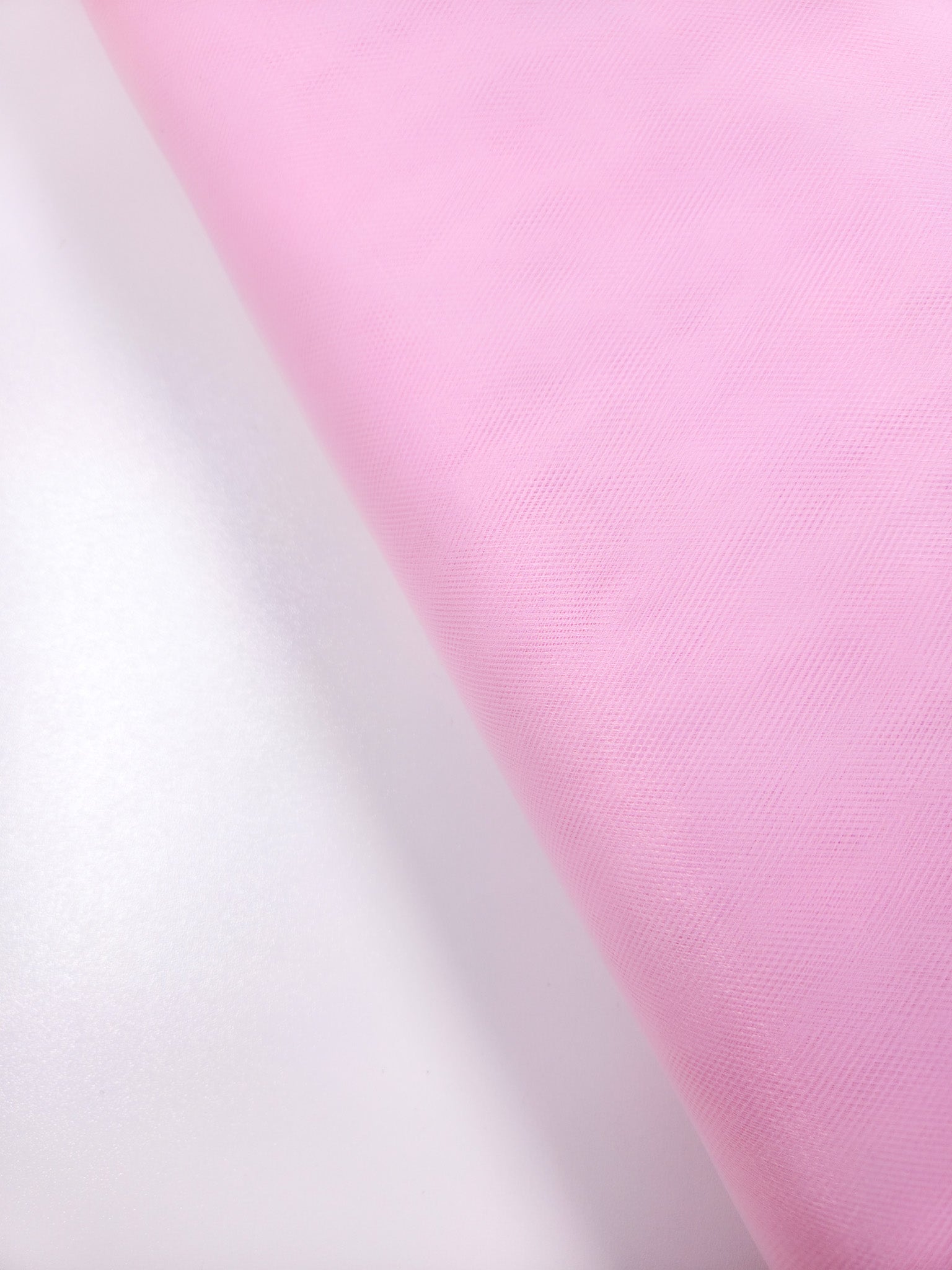 A close-up of Super Cheap Fabrics’ Soft Tulle - Baby Pink - 150cm, a gently textured fabric ideal for costumes or veils, rolled out on a light surface. Soft lighting enhances its delicate pastel appearance.
