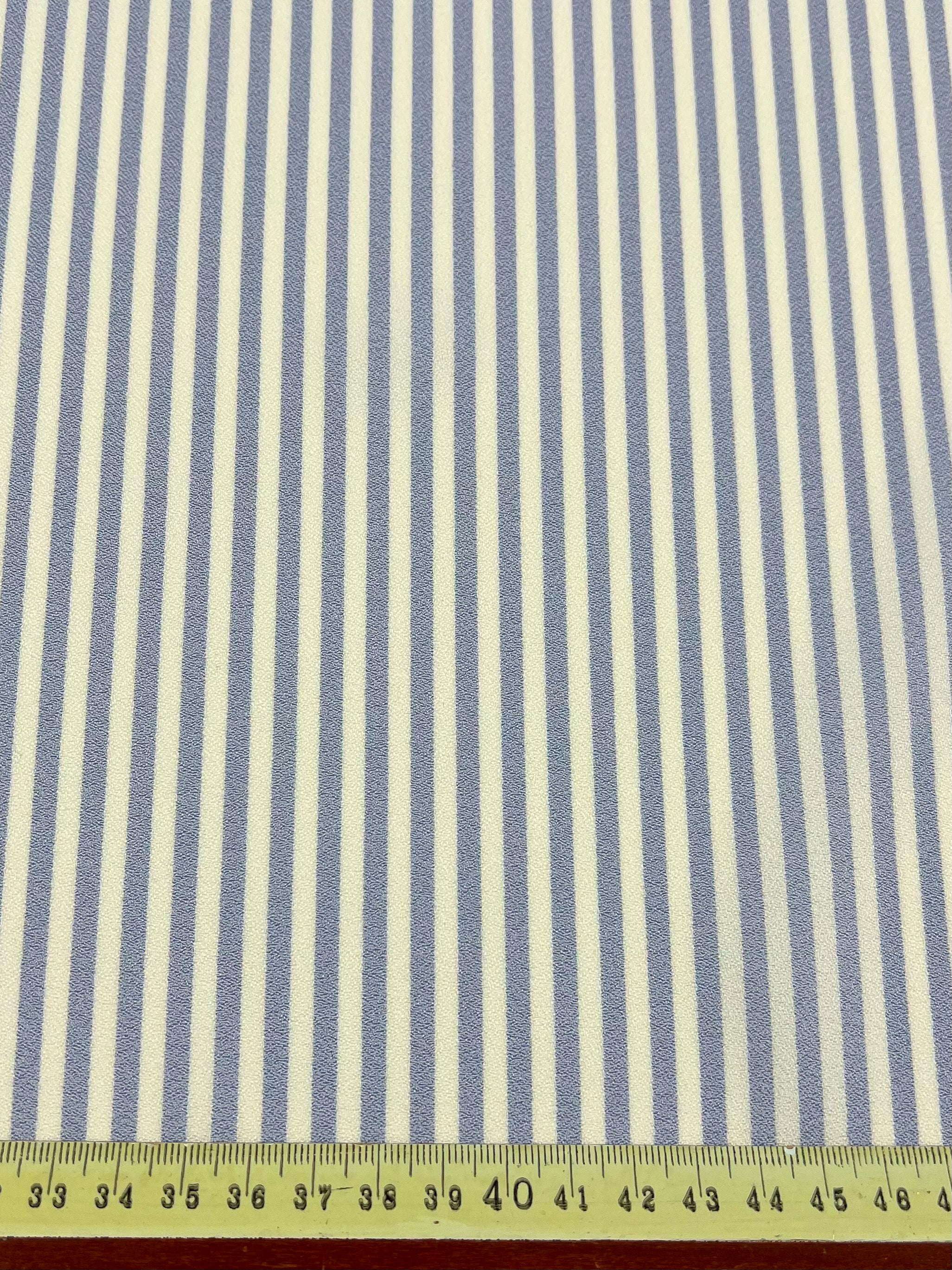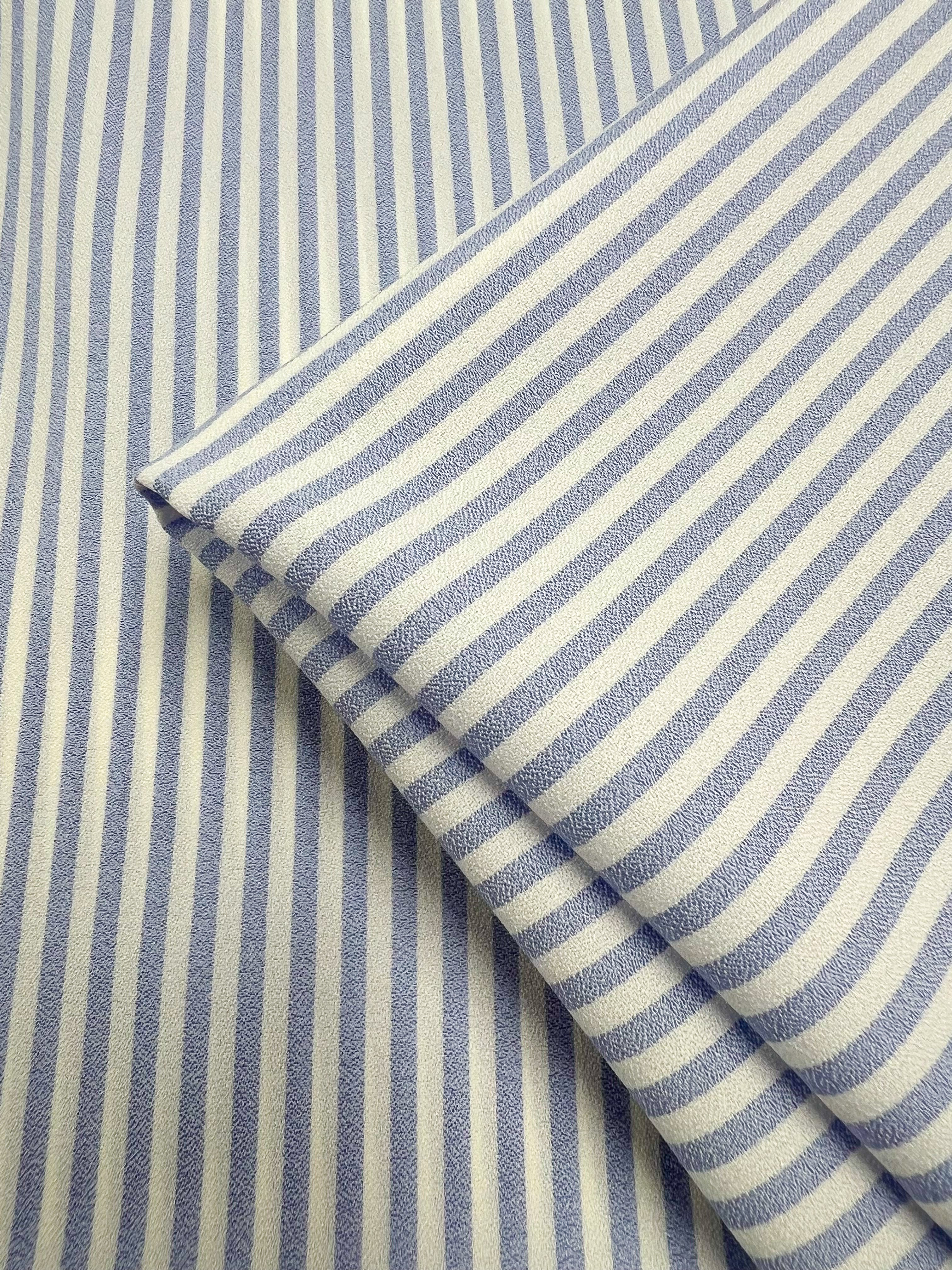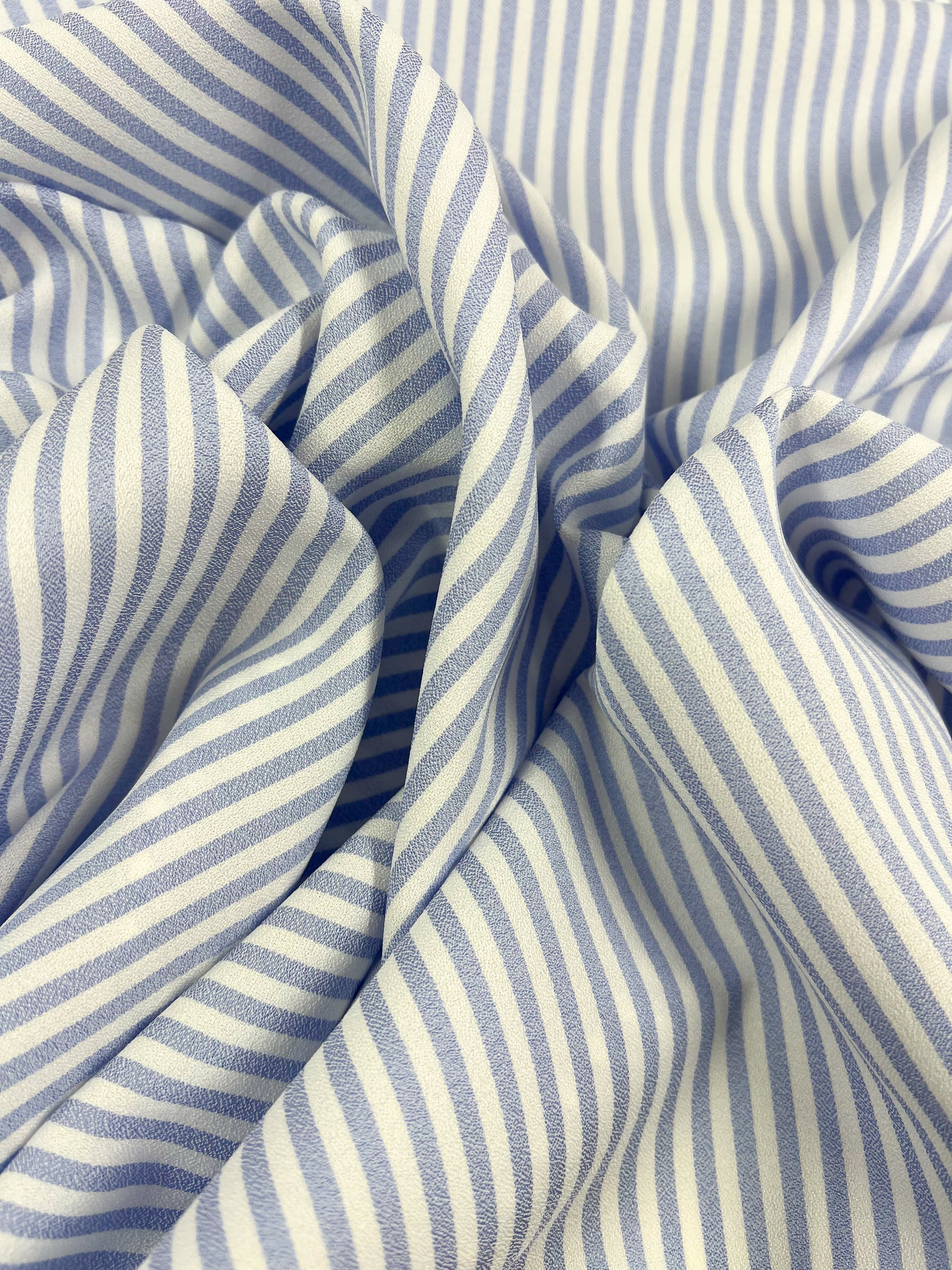 Striped Crepe - Pale Iris by Super Cheap Fabrics is a lightweight fabric with evenly spaced 1 cm vertical blue and white stripes, ideal for eveningwear or tailored shirts. Fabric width: 150cm.
