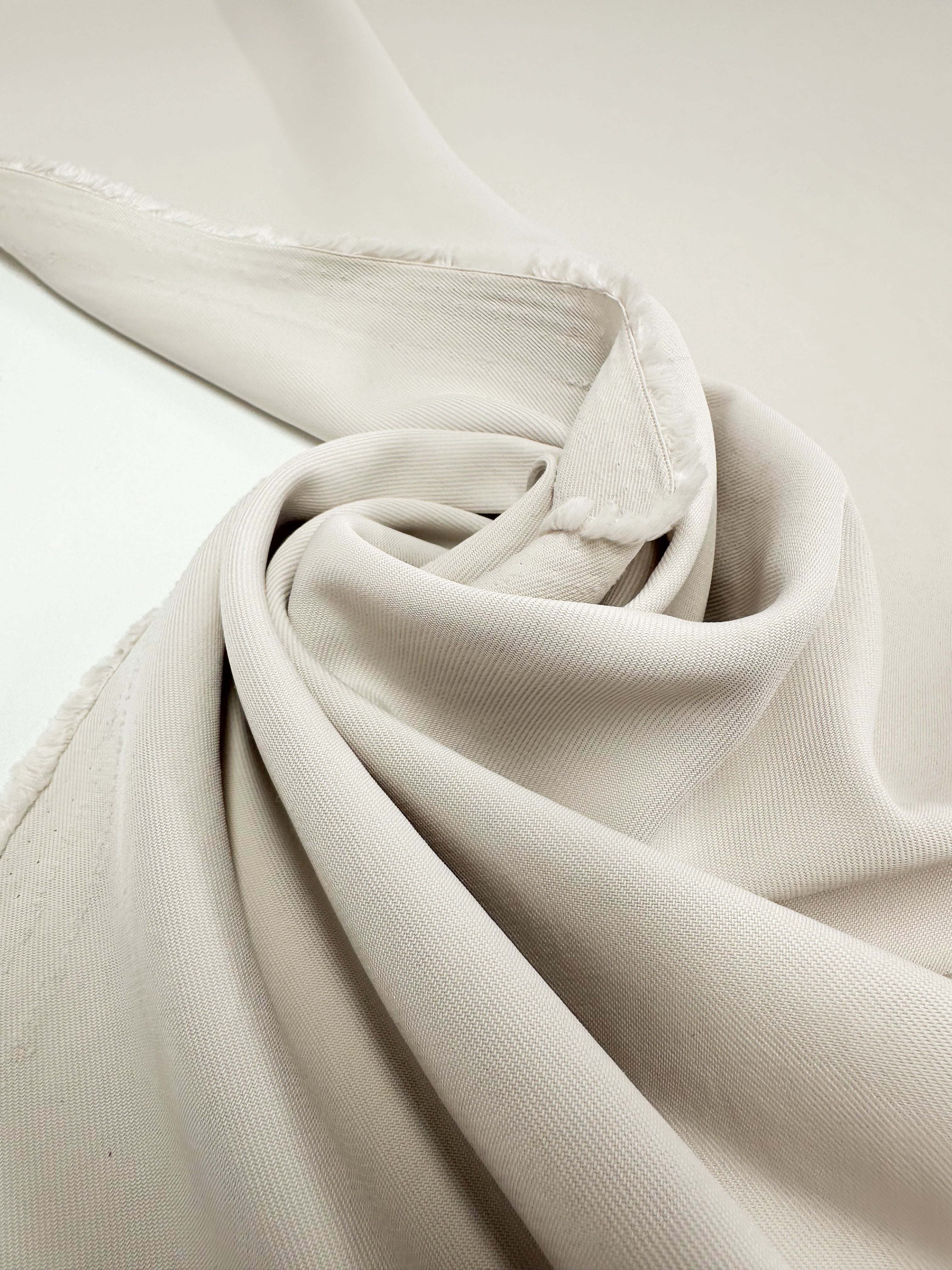 A close-up of Suiting - White Swan - 142cm by Super Cheap Fabrics, featuring light beige polyester fabric with a subtle texture, loosely folded and draped in soft layers, highlighting its unfinished edges.