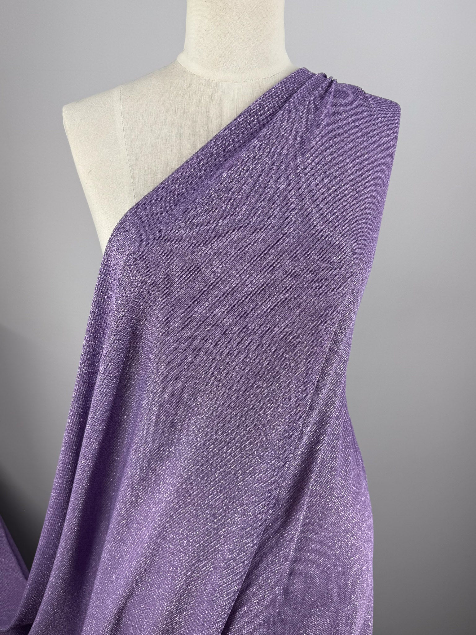 A rich viscose lurex knit with a subtle shimmer and soft, fluid drape. Lightweight and comfortable, this ribbed Knit is ideal for elegant tops, dresses, and relaxed eveningwear.