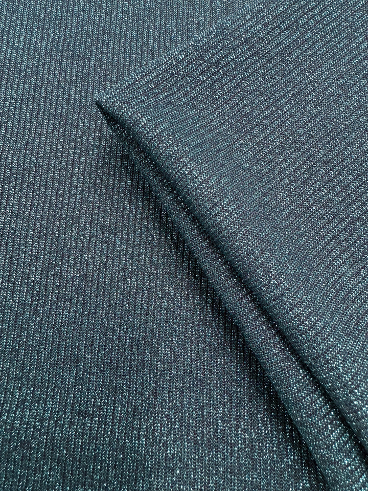 A shimmering teal viscose, lurex knit fabric with subtle metallic depth.